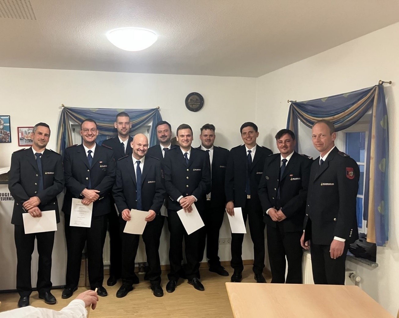 Die beförderten v.l.n.r.: Lucas Frey, Simon Hamm (beide Hauptfeuerwehrmann), Felix Gittinger, Kevin Werner, Michael Härtel, Patrick Schorsten, Sebastian Renn, Michael Rimmele (alle Feuerwehrmann), Kommandant Stefan Kauer (Brandmeister), stellv. Bürgermeister und Jugendwart Michael Gittinger